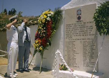 Keywords: Wreath laying ceremony DVIDS187872.jpg en Lt Cmdr Joaquin Correia executive officer of the Naval Computer and Telecommunication Station at Naval Air Station Sigonella and Dr Giuseppe Abbate from the Gela Kiwanis Club render honors during a memorial service at the site of the Battle of Ponte Dirillo during a wreath laying ceremony The ceremony marked the 66th anniversary of the Allied invasion of Sicily in 1943 Thirty-nine U S service members lost their lives during the fighting at Ponte Dirillo 2009-07-09 https //www dvidshub net/image/187872 090709-N-+++++-067 2009-07-16 02 19 GELA PD-USGov-Military-Navy Naval Air Station Sigonella Images from DoD uploaded by Fæ |