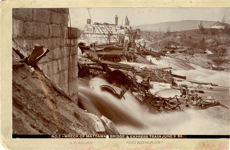 | Keywords: bridge disaster train wreck trainwreck j f cooke jfcooke unidentified person unidentifiedperson photo border This photograph, dated June 9, 1894, is labelled "Number 3: Wreck of Mattawan Bridge & Express Train." The photograph shows debris partly submerged in a swift-flowing river, with remains of the bridge and onlookers. The photographer is J.F. Cooke of Port Arthur, Ontario. Accession 1991-01 #101 This photograph is in the public domain as all copyright has expired. For more information about Thunder Bay's history, visit www.thunderbay.ca/archives This photograph, dated June 9, 1894, is labelled "Number 3: Wreck of Mattawan Bridge & Express Train." The photograph shows debris partly submerged in a swift-flowing river, with remains of the bridge and onlookers. The photographer is J.F. Cooke of Port Arthur, Ontario. Accession 1991-01 #101 This photograph is in the public domain as all copyright has expired. For more information about Thunder Bay's history, visit www.thunderbay.ca/archives |