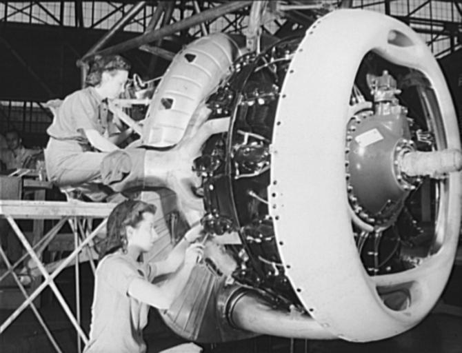 Keywords: Wright R-2600 engine for A-31 bomber at Vultee Nashville 1943.jpg Two women employees at the Nashville Division of Vultee Aircraft Inc are shown installing the exhaust-collector ring on a Wright R-2600-A5B-5 Twin Cyclone 14 cylinder radial air-cooled engine which will go into a Vultee A-31 Vengeance dive bomber LOC-image fsa 8b06369 1943-02 Alfred T Palmer frame removed PD-USGov Wright R-2600 Vultee A-31 Vengeance Photographs by Alfred T Palmer |