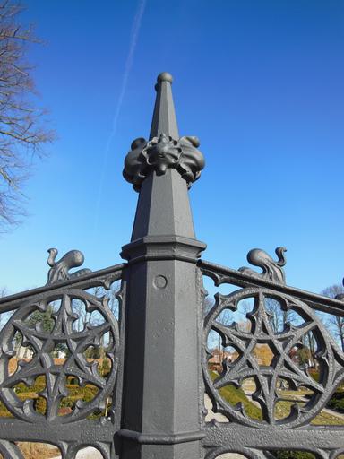 Keywords: wrought iron gates old patterned beautiful metallic detail spiers figurines cemetery gate