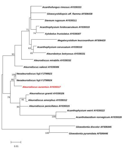 | Keywords: Wu-Neoaleurodiscus-Maximum Likelihood-Tree.svg Figure Molecular Phylogenetic analysis by the Maximum Likelihood method of Acanthobasidium Aleurodiscus s s and Neoaleurodiscus The evolutionary history was inferred by using the Maximum Likelihood method based on the Tamura-Nei model 1 The tree with the highest log likelihood -2842 6486 is shown The percentage of trees in which the associated taxa clustered together is shown next to the branches Initial tree s for the heuristic search were obtained by applying the Neighbor-Joining method to a matrix of pairwise distances estimated using the Maximum Composite Likelihood MCL approach A discrete Gamma distribution was used to model evolutionary rate differences among sites 5 categories +G parameter 0 1738 The rate variation model allowed for some sites to be evolutionarily invariable +I 68 6716 sites The tree is drawn to scale with branch lengths measured in the number of substitutions per site The analysis involved 20 nucleotide sequences There were a total of 964 positions in the final dataset Evolutionary analyses were conducted in http //megasoftware net/ MEGA6 2 <br/> For all taxa the GenBank number of the DNA-sequence is shown For the tree the same sequences are used which Sheng-Hua Wu used for his most parsimonious tree 5 In addition the sequence of Aleurodiscus aurantius AY039317 in red was used for the calculation of the LM-tree <br/> <br/> 1 Tamura K and Nei M 1993 Estimation of the number of nucleotide substitutions in the control region of mitochondrial DNA in humans and chimpanzees Molecular Biology and Evolution 10 512-526 <br/> 2 Tamura K Stecher G Peterson D Filipski A and Kumar S 2013 MEGA6 Molecular Evolutionary Genetics Analysis version 6 0 Molecular Biology and Evolution30 2725-2729 <br/> 3 Sheng-Hua Wu Dong-Mei Wang Shi-Yi Yu Neoaleurodiscus fujii a new genus and new species found at the timberline in Japan In The Mycological Society of America Hrsg Mycologia Vol 102 1 Lawrence 2010 S 217 “223<br/> ; List with GenBank Sequences http //www ncbi nlm nih gov/nuccore/AY039326 Aleurodiscus grantii strain T569 http //www ncbi nlm nih gov/nuccore/AY039312 Aleurodiscus amorphus strain HHB15282 http //www ncbi nlm nih gov/nuccore/AF506397 Aleurodiscus amorphus - AF506397 http //www ncbi nlm nih gov/nuccore/AY039315 Acanthobasicium penicillatum strain T322 http //www ncbi nlm nih gov/nuccore/AY039322 Aleurodiscus weirii strain HHB12678 http //www ncbi nlm nih gov/nuccore/AY039328 Acanthobasidium norvegicum strain T623 http //www ncbi nlm nih gov/nuccore/AY039317 Aleurodiscus aurantius strain T621 http //www ncbi nlm nih gov/nuccore/FJ799924 Neoaleurodiscus fujii strain Wu0807-41 http //www ncbi nlm nih gov/nuccore/FJ799923 Neoaleurodiscus fujii strain Wu0807-40 http //www ncbi nlm nih gov/nuccore/AF506445 Gloeodontia discolor AF506445 http //www ncbi nlm nih gov/nuccore/AF506446 Gloeodontia pyramidata AF506446 http //www ncbi nlm nih gov/nuccore/AY039333 Acanthofungus rimosus AY039333 http //www ncbi nlm nih gov/nuccore/AY039311 Stereum rugosum AY039311 http //www ncbi nlm nih gov/nuccore/AY039319 Acanthophysium lividocaeruleum AY039319 http //www ncbi nlm nih gov/nuccore/AY039307 Xylobolus frustulatus AY039307 http //www ncbi nlm nih gov/nuccore/AY039310 Acanthophysium cerussatum AY039310 http //www ncbi nlm nih gov/nuccore/AY039331 Aleurobotrys botryosus AY039331 http //www ncbi nlm nih gov/nuccore/AF506438 Gloeocystidiopsis aff flamma AF506438 http //www ncbi nlm nih gov/nuccore/AY039332 Aleurodiscus mirabilis AY039332 http //www ncbi nlm nih gov/nuccore/AY039306 Aleurodiscus oakesii AY039306 http //www ncbi nlm nih gov/nuccore/AF506420 Megalocystidium leucoxanthum AF506420 own 2014-08-24 Thkgk Cc-zero Acanthobasidium Aleurodiscus penicillatus Aleurodiscus Neoaleurodiscus |