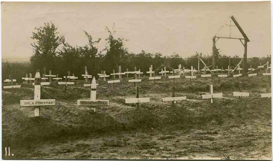Keywords: the great war thegreatwar great war greatwar world war i worldwari world war one worldwarone the first world war thefirstworldwar wwi ww1 grave marker gravemarker wooden crosses woodencrosses military cemetery militarycemetery a.c. copeman accopeman copeman toul france toul, france toulfrance outdoor View of an American cemetery on a battlefield near Toul, France, during World War I, featuring makeshift wooden crosses made from fence posts as grave markers. A grave marker for a Corporal A.C. Copeman is pictured. Caption on back reads in Henry Graves handwriting: “An American cemetery near Toul, France” (circa 1918) [Photograph taken or collected by Henry L. Graves]. --From Henry L. Graves Papers, WWI 55, Military Collection, State Archives of North Carolina View of an American cemetery on a battlefield near Toul, France, during World War I, featuring makeshift wooden crosses made from fence posts as grave markers. A grave marker for a Corporal A.C. Copeman is pictured. Caption on back reads in Henry Graves handwriting: “An American cemetery near Toul, France” (circa 1918) [Photograph taken or collected by Henry L. Graves]. --From Henry L. Graves Papers, WWI 55, Military Collection, State Archives of North Carolina |