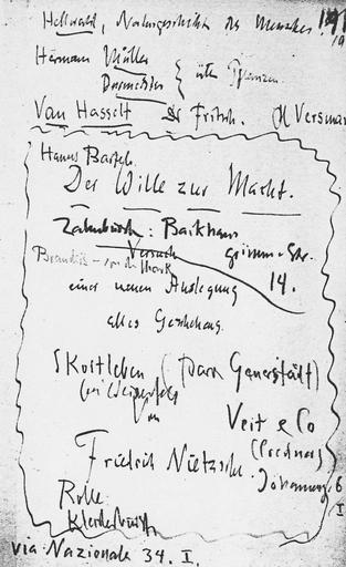 | Keywords: WzM Zahnbürste.JPG de Titelentwurf zu žDer Wille zur Macht von Friedrich Nietzsche später offenbar für private Notizen Bücher und Einkäufe verwendet Faksimile in Erich Podach Friedrich Nietzsches Werke des Zusammenbruchs Heidelberg 1961 Abbildung XXIV nach S 432 Aus dem Notizheft N VII 2 S 194 Jetzt Nachlassfragment Herbst 1885 “ Frühjahr 1886 135 en Draft of a title for žDer Wille zur Macht by Friedrich Nietzsche Apparently Nietzsche later used this page for more profane notes titles of books and a place to buy a toothbrush Facsimile from Erich Podach Friedrich Nietzsches Werke des Zusammenbruchs Heidelberg 1961 figure XXIV after p 432 From the notebook N VII 2 p 194 Cf Colli-Montinari edition fragment autumn 1885 “ spring 1886 135 Draft of a title by Nietzsche for žDer Wille zur Macht The Will to Power with other notes on it Facsimile in Erich Podach Friedrich Nietzsches Werke des Zusammenbruchs Heidelberg 1961 circa 1885 /1886 Creator Friedrich Nietzsche PD because of age PD-old-100 Friedrich Nietzsche Notebooks |