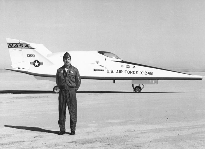 MAKE A MEME View Large Image X-24 DVIDS843207.jpg en E-29374 This photo shows Air Force Lieutenant Colonel Michael V Love in front of the X-24B lifting body research vehicle at Edwards Air Force Base in 1976 Love was assigned as a project pilot on the joint NASA-USAF ...