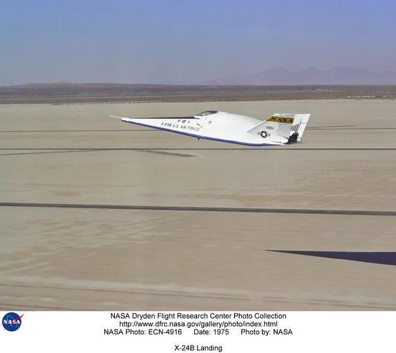 | Keywords: X-24B Landing DVIDS689316.jpg en The X-24B is seen here landing on Rogers Dry Lake adjacent to the NASA Dryden Flight Research Center Edwards California The X-24B was the last aircraft to fly in Dryden's manned lifting body program The X-24B's design evolved from a family of potential reentry shapes each with higher lift-to-drag ratios proposed by the Air Force Flight Dynamics Laboratory The X-24B is on public display at the Air Force Museum Wright-Patterson AFB Ohio The X-24 was one of a group of lifting bodies flown by the NASA Flight Research Center now Dryden Flight Research Center Edwards California in a joint program with the U S Air Force at Edwards Air Force Base from 1963 to 1975 The lifting bodies were used to demonstrate the ability of pilots to maneuver and safely land wingless vehicles designed to fly back to Earth from space and be landed like an airplane at a predetermined site Lifting bodies' aerodynamic lift essential to flight in the atmosphere was obtained from their shape The addition of fins and control surfaces allowed the pilots to stabilize and control the vehicles and regulate their flight paths Built by Martin Aircraft Company Maryland for the U S Air Force the X-24A was a bulbous vehicle shaped like a teardrop with three vertical fins at the rear for directional control It weighed 6 270 pounds was 24 5 feet long and 11 5 feet wide measuring just the fuselage not the distance between the tips of the outboard fins Its first unpowered glide flight was on April 17 1969 with Air Force Maj Jerauld Gentry at the controls Gentry also piloted its first powered flight on March 19 1970 The X-24A was flown 28 times in the program that like the HL-10 validated the concept that a Space Shuttle vehicle could be landed unpowered The fastest speed achieved by the X-24A was 1 036 miles per hour mph-Mach 1 6 Its maximum altitude was 71 400 feet It was powered by an XLR-11 rocket engine with a maximum theoretical vacuum thrust of 8 480 pounds The X-24A was later modified into the X-24B The bulbous shape of the X-24A was converted into a flying flatiron shape with a rounded top flat bottom and double delta platform that ended in a pointed nose The X-24B demonstrated that accurate unpowered reentry vehicle landings were operationally feasible Top speed achieved by the X-24B was 1 164 mph and the highest altitude it reached was 74 130 feet The vehicle is on display at the Air Force Museum Wright-Patterson Air Force Base Ohio The pilot on the last powered flight of the X-24B was Bill Dana who also flew the last X-15 flight about seven years earlier The X-24A shape was later borrowed for the X-38 Crew Return Vehicle CRV technology demonstrator for the International Space Station NASA Identifier NIX-ECN-4916 2009-09-24 Glenn Research Center https //www dvidshub net/image/689316 689316 2012-10-10 12 08 WASHINGTON DC US PD-USGov Aircraft at Rogers Dry Lake Aircraft landing at Edwards Air Force Base Images from DoD uploaded by Fæ Martin-Marietta X-24 |