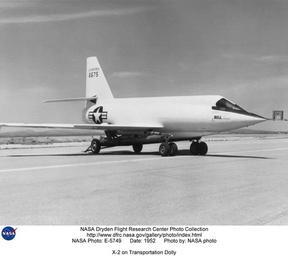 Keywords: X-2 on Transportation Dolly DVIDS734540.jpg en This 1952 photograph shows the X-2 2 aircraft mounted on a special transportation dolly at Edwards Air Force Base California The dolly was steerable and was used for transporting the X-2 around and for towing it off the lakebed at Edwards Air Force Base after a landing This was the number 2 airplane 46-675 which was lost on May 12 1953 on a captive flight over Lake Ontario when the airplane exploded during a liquid-oxygen topoff test killing the pilot Jean Ziegler and EB-50A crewman Frank Wolko Almost no debris was recovered from Lake Ontario so no cause for the explosion could be determined Later however investigations of similar explosions in the X-1 3 X-1A and X-1D traced the problem to Ulmer leather gaskets which exuded tricresyl phosphate This substance caused detonations in the supercold atmosphere of the airplanes' liquid oxygen tanks As the X-2 2 also had these gaskets they were probably the cause of the explosion in that aircraft as well The X-2 was a swept-wing rocket-powered aircraft designed to fly faster than Mach 3 three times the speed of sound It was built for the U S Air Force by the Bell Aircraft Company Buffalo New York The X-2 was flown to investigate the problems of aerodynamic heating as well as stability and control effectiveness at high altitudes and high speeds in excess of Mach 3 Bell aircraft built two X-2 aircraft These were constructed of K-monel a copper and nickel alloy for the fuselage and stainless steel for the swept wings and control surfaces The aircraft had ejectable nose capsules instead of ejection seats because the development of ejection seats had not reached maturity at the time the X-2 was conceived The X-2 ejection canopy was successfully tested using a German V-2 rocket The X-2 used a skid-type landing gear to make room for more fuel The airplane was air launched from a modified Boeing B-50 Superfortress Bomber X-2 Number 1 made its first unpowered glide flight on Aug 5 1954 and made a total of 17 4 glide and 13 powered flights before it was lost Sept 27 1956 The pilot on Flight 17 Capt Milburn Apt had flown the aircraft to a record speed of Mach 3 2 2 094 mph thus becoming the first person to exceed Mach 3 During that last flight inertial coupling occurred and the pilot was killed The aircraft suffered little damage in the crash resulting in proposals never implemented from the Langley Memorial Aeronautical Laboratory Hampton Virginia to rebuild it for use in a hypersonic Mach 5+ test program In 1953 X-2 Number 2 was lost in an in-flight explosion while at the Bell Aircraft Company during captive flight trials and was jettisoned into Lake Ontario The Air Force had previously flown the aircraft on three glide flights at Edwards Air Force Base California in 1952 Although the NACA's High-Speed Flight Station Edwards California predecessor of NASA's Dryden Flight Research Center never actually flew the X-2 aircraft the NACA did support the program primarily through Langley Memorial Aeronautical Laboratory wind-tunnel tests and Wallops Island Virginia rocket-model tests The NACA High-Speed Flight Station also provided stability-and-control recording instrumentation and simulator support for the Air Force flights In the latter regard the NACA worked with the Air Force in using a special computer to extrapolate and predict aircraft behavior from flight data NASA Identifier NIX-E-5749 2009-09-23 Glenn Research Center https //www dvidshub net/image/734540 734540 2012-10-17 20 29 WASHINGTON DC US PD-USGov Aircraft at Rogers Dry Lake Images from DoD uploaded by Fæ Bell X-2
