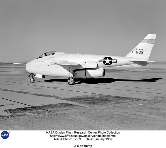 | Keywords: X-5 on Ramp DVIDS692292.jpg  en This NACA High-Speed Flight Research Station photograph of the X-5 was taken at the South Base of Edwards Air Force Base in 1952 The photograph is a left side view of the aircraft on the ramp The Bell X-5 was flight tested at the NACA High-Speed Flight Research Station now the NASA Dryden Flight Research Center Edwards California from 1952 to 1955 The X-5 was the first aircraft capable of sweeping its wings in flight It helped provide data about wing-sweep at angles of up to 60 degrees at subsonic and transonic speeds There were two X-5 vehicles Ship 1 was flown at the NACA High-Speed Flight Research Station High-Speed Flight Station as it was redesignated in 1954 from 1951 to 1955 Ship 2 was operated by Bell and the U S Air Force and was lost in a spin accident in 1953 Following the conclusion of the contractor's test program the X-5 was grounded for installation of a NACA instrument package The Air Force conducted a short six-flight evaluation program Since the Air Force evaluation program included data collection it was considered as part of the overall NACA effort and flights were logged as AF/NACA In the NACA test program the X-5 demonstrated severe stall-spin instability The X-5 was also used as a chase plane for other research aircraft because it could vary its flying characteristics to suit the airplane it was chasing Ship 1 flew a total of 133 flights during its three years of service In spite of the problems with the aircraft the X-5 provided a significant full-scale verification of NACA wind-tunnel predictions for reduced drag and improved performance that resulted from this configuration's increasing the wing sweep as the speed of the aircraft approached the speed of sound The X-5 flight tests provided some of the design data for the Air Force F-111 and Navy F-14 tactical aircraft Although the mechanism by which the X-5 changed its wing sweep made this particular design impractical development of a viable variable-sweep aircraft had to await Langley Aeronautical Laboratory's concept of an outboard wing pivot in the mid-1950s Langley was a NACA research laboratory in Hampton Virginia The X-5 was a single seat aircraft powered by an Allison J-35-A-17A jet engine It was 33 33 feet long with a wingspan of 20 9 feet with the wings swept back at an angle of 60 degrees to 33 5 feet with the wings unswept When fully fueled the X-5 weighed 9 875 pounds NASA Identifier NIX-E-653 2009-09-23 Glenn Research Center https //www dvidshub net/image/692292 692292 2012-10-10 12 48 WASHINGTON DC US PD-USGov Aircraft at Edwards Air Force Base Images from DoD uploaded by Fæ Bell X-5 |