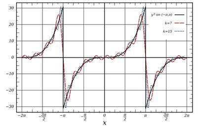 Keywords: XCubed Fourier Series Approximation n=7,15.svg This is a graph of x<sup>3</sup> periodic on - with the Fourier Series Approximations drawn in at k 7 red and k 15 blue The approximation is given by <math>f\left x \right \approx \sum\limits_ n 1 k - 2\left - 1 \right n \left \pi 2 n 2 - 6 \right \over n 3 \sin \left nx \right </math> This is the counterpart to this which has just the original function drawn in Own Drawing Plotted in Mathematica edited in Inkscape 2008-02-22 Inductiveload image XCubed Periodic -pi pi svg Mathematica Code <pre><nowiki> fx_ x 3; ffourx_ k_ Hold Sum -2 -1 n Pi 2 n 2 - 6 / n 3 Sinn x n 1 k ; Plot fModx 2 \Pi -\Pi ReleaseHoldffourx 7 ReleaseHoldffourx 15 x -2 Pi 2 Pi </nowiki></pre> Fourier series |