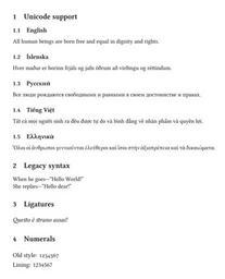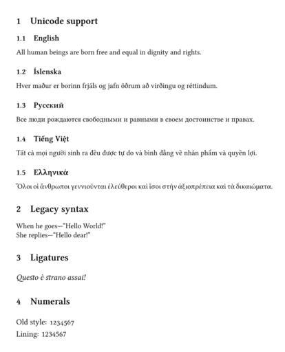 | Keywords: XeTeX sample.svg Sample XeTeX output Beispiel einer XeTeX-Ausgabe I created this work entirely by myself Compiled on Mac OS from source code see below 20 40 6 June 2010 UTC DarTar <span class signature-talk >talk</span> XeTeX source <source lang latex > \documentclass11pt article \usepackage xltxtra \setmainfontMapping tex-text Linux Libertine O \begin document \section Unicode support \subsection English All human beings are born free and equal in dignity and rights \subsection Íslenska Hver maður er borinn frjáls og jafn öðrum að virðingu og réttindum \subsection Русский Все люди ождаются свободными и авными в своем достоинстве и п авах \subsection Tiếng Việt Tất cả mọi ngư i sinh ra đều được tự do và bình đẳng về nhân phẩm và quyền lợi \subsection Ελληνικά Ὅλοι οἱ ἄνθρω οι γεννιοῦνται ἐλεύθεροι καὶ ἴσοι στὴν ξιο ρέ εια καὶ τὰ δικαιώματα \section Legacy syntax When he goes---``Hello World \\ She replies Hello dear \section Ligatures \fontspecLigatures Common Historical Linux Libertine O Italic \fontsize 12pt 18pt \selectfont Questo è strano assai \section Numerals \fontspecNumbers OldStyle Linux Libertine O Old style 1234567\\ \fontspecNumbers Lining Linux Libertine O Lining 1234567 \end document </source> Images with LaTeX source code XeTeX |
