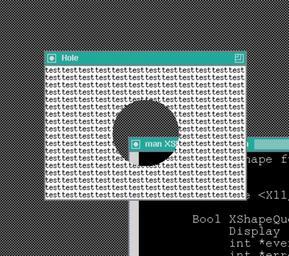 | Keywords: Xhole.png A window with a hole in the middle Used to illustrate the X Window shape extension The decorative frames etc are generated by twm The program that creates this window is below; it has been written by User Tizio who release it in the public domain I have took the screenshot myself <source lang c> / xhole c A sample application using the shape extension Creates a window with a hole in the middle Works with twm fvwm and mwm but kde refuses to add a title bar to it Compile with `gcc xhole c -o xhole -lX11 -lXext' / include <stdio h> include <stdlib h> include <X11/Xlib h> include <X11/extensions/shape h> int main int argc char argv Display d; int s; Window w; Pixmap p; GC gw gp; XEvent e; int x y; / open connection with the server / d XOpenDisplay NULL ; if d NULL printf Cannot open display\n ; exit 1 ; s DefaultScreen d ; gw DefaultGC d s ; / create window select events map / w XCreateSimpleWindow d RootWindow d s 10 10 300 200 1 BlackPixel d s WhitePixel d s ; XSelectInput d w ExposureMask KeyPressMask ButtonPressMask ; XStoreName d w XHole ; XMapWindow d w ; / create the pixmap that specifies the shape / p XCreatePixmap d w 400 300 1 ; gp XCreateGC d p 0 NULL ; XSetForeground d gp WhitePixel d s ; XFillRectangle d p gp 0 0 400 300 ; XSetForeground d gp BlackPixel d s ; XFillArc d p gp 120 100 100 100 0 360 64 ; / set the pixmap as the new window mask; the pixmap is slightly larger than the window to allow for the window border and title bar as added by the window manager to be visible / XShapeCombineMask d w ShapeBounding -20 -50 p ShapeSet ; / event polling loop / while 1 XNextEvent d e ; / draw or redraw the window / if e type Expose / not the correct way of drawing text / for y 10; y < 210; y + 11 for x 0; x < 300; x + 25 XDrawString d w gw x y test 4 ; / exit on button press / if e type ButtonPress break; / close connection to display / XCloseDisplay d ; return 0; </source> <br/> Transferred from http //en wikipedia org en wikipedia to Commons by User JohnnyMrNinja using http //tools wikimedia de/~magnus/commonshelper php CommonsHelper 2006-01-02 ; 2006 01 11 last version Tizio at http //en wikipedia org en wikipedia twm is under the MIT License Free screenshot MIT Tizio Original upload log en wikipedia Xhole png 2006-01-11 20 38 Tizio 433×384×8 8179 bytes <nowiki>Cleaner version</nowiki> 2006-01-02 13 08 Tizio 448×387×8 8253 bytes <nowiki>A window with a hole in the middle Used to illustrate the X Window shape extension </nowiki> Twm Xlib Shape extension |