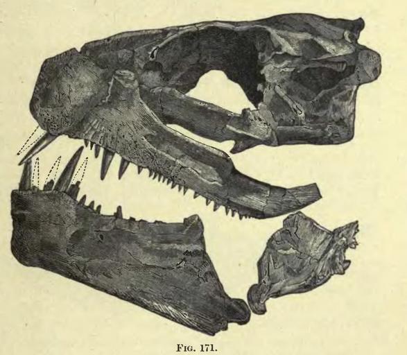 Keywords: Xiphactin skull.JPG shull of Xiphactinus Че еп ксифактина по теуса из Циттеля 1913 1913 Э Д Коуп PD-old Xiphactinus fossils Xiphactinus skulls