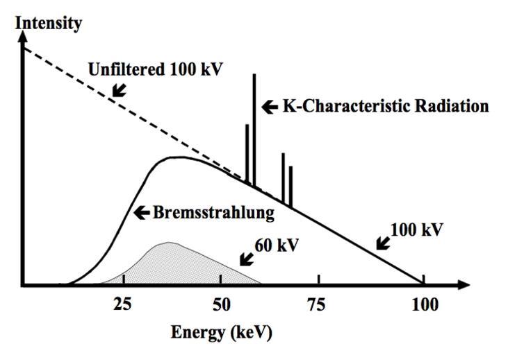 Keywords: XrtSpectrum.jpg en The X-ray energy spectrum generated by an X-ray tube own Kieranmaher 2001-01-01 Reproduced with permission from Heggie JCP Liddell NA Maher KP 2001 Applied Imaging Technology 4th Edition Physics diagrams