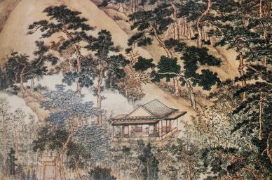 Keywords: Xu Yang - Hermit's cottage in the mountains.jpg between 1736 1796 Chinese scroll painting object history credit line accession number own scan by Szilas PD-old-100 Xu Yang Prosperous Suzhou