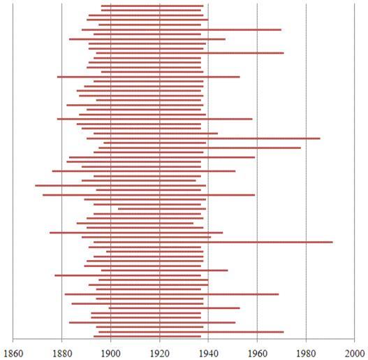 | Keywords: XVII съезд ВКП (б).GIF en Life durations of members of Central Committee chosen on the 17th Congress of the All-Union Communist Party Bolsheviks ru Годы жизни членов Цент ального Комитета ВКП б изб анных XVII съездом Данные из Википедии п едставленные в виде г афика ихаил Дво кин 2009-11-28 1934 Bar charts |