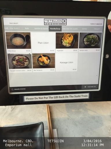 I love TETSUJIN but I am unhappy that there are only 4 options for udon soup under noodle section. I wish I can order (small/big)udon soup only without any toppings under "noodle" section on the iPad ordering system. Next to the "udon only" icon, there will be another icon to link to the side dishes section. This will turn 4 udon options to 30 udon options which would greatly increase Sales, profits and your Salary increments and bonuses at zero cost. Simply add a plain Udon only option on the IPAD would cost next to nothing.