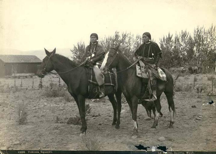 Keywords: Yakama Indian women on horseback, Washington, 1899 (LAROCHE 169).jpeg Photograph Creator Frank La Roche Two Yakama women pose on horseback in pasture; in background is a barn and a horse-drawn wagon The women are wearing traditional clothing with necklaces earrings bracelets rings and are riding barefoot Caption on image Yakima squaws Subjects LCTGM Horses Subjects LCSH Yakama Indians--Clothing dress; Yakama Indians--Women; Yakama Indians--Transportation depicted place Washington state 1899 Institution University of Washington UWASH-LAROCHE-source accession number laroche 169 PD-old-auto-1923 1936 Information field Order Number LAR142 Yakama Females with horses Horse riding in the United States Horses of Native Americans 1899 in Washington state People of Washington state Unidentified locations in Washington state Black and white photographs |