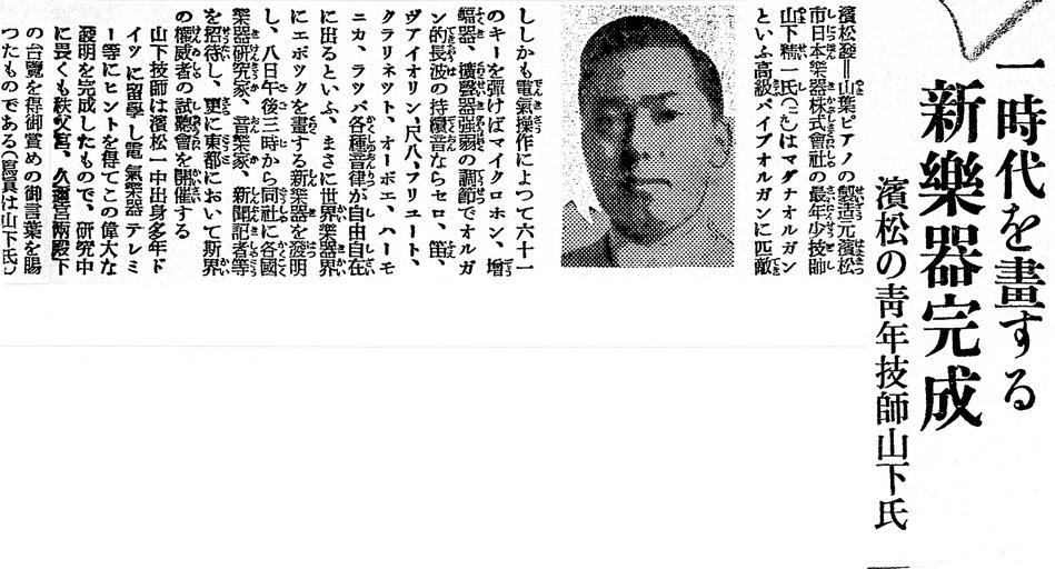 Keywords: Yamaha Magna Organ article on Hochi Shimbun 1935-06-08 (clip).jpg ja <br/> ; 時代を畫する新樂器完成 ;濱 の 年 師山下氏 濱 發 山葉ピアノの製 元濱 市日 樂器株式 社の 年少 師山下精 氏(二 )はマグナオルガンという高級パイプオルガンに匹敵ししかも電氣操 によって六十 のキーを彈けばマイクロホン 增幅器 擴聲器強弱の調 でオルガン的長波の持續音ならセロ 笛 ヴァイオリン 尺八 フリュート クラリネット オー エ ハーモニカ ラッパ各種音律が自由自 に出るといふ まさに世界樂器界にエ ックを畫する新樂器を發明し 八日午後三時から同社に各 樂器研究家 音樂家 新聞記 等を招待し 更に 都において斯界の権威 の試聽 を開催する 山下 師は濱 中出身多年ドイツに留學し電氣樂器テレミー等にヒントを得てこの偉大な發明を完成したもので 研究中に畏くも秩父宮 久邇宮両殿下の台覧を得御賞めの御 葉を ったものである(寫 は山下氏) References Hochi Shimbun 1935-06-08 2014-05-25 14 36 18 originally published in 1935-06-08 Yamaha Magna Organ article on Hochi Shimbun 1935-06-08 tiff Yamaha Magna Organ article on Hochi Shimbun 1935-06-08 tiff Hochi Shimbun derived work clusternote clipped corrected horizontal vertical remove background noise and converted to JPG clusternote Yamaha Magna Organ article on Hochi Shimbun 1935-06-08 tiff cc-zero Uploaded with UploadWizard Yamaha Magna Organ 1935 |