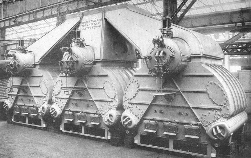 | Keywords: Yarrow boilers for Chilian battleship (Rankin Kennedy, Modern Engines, Vol VI).jpg A flat of three Yarrow boilers assembled in Yarrow's works before delivery A painted caption reads Yarrow boilers for Chilian sp Chilean Battleship Spelling of Chilian is original Yarrow boilers |