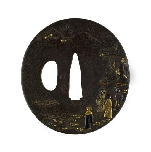 Keywords: Yasuda Masasada - Tsuba with Chinese Star Gods - Walters 51336.jpg The three Chinese star gods Lu Fu and Shou are collectively worshiped to bring good fortune The stars appear at the upper left of the tsuba just above the distant mountains At the lower right of the composition the personifications of the stars stand beneath a pine tree A fourth man has his back to the viewer observing them On the reverse another Chinese gentleman stands gazing to the left In the mountains behind him the top of a temple pagoda stands among the mountain peaks 1st half Other date century 18 mid Edo iron silver gold shakudo cm 6 98 6 58 0 43 accession number 51 336 28742 Henry Walters Baltimore date and mode of acquisition unknown Walters Art Museum Henry Walters Acquired by Henry Walters Signature Masasada place of origin Edo present-day Tokyo Japan Walters Art Museum license Tosogu Japanese sword fittings in the Walters Art Museum Yasuda Masasada Media contributed by the Walters Art Museum needs category review |