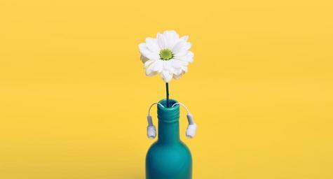Keywords: yellow daisy bottle vase headphones earbuds decor