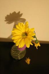 Keywords: Yellowflower.jpg en There are two yellow flowers on a purple vase One is pretty the other is dead own LuciaSofo Flower bouquets Yellow flowers