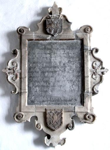 | Keywords: Yeo-Killigrew Monument 1636 ChittlehamptonChurch Devon.PNG en Mural monument to Edmond Yeo d 1636 of Hawkridge Chittlehampton Devon erected by his widow Elizabeth Killigrew St Hieritha's Church Chittlehampton east wall of south transept Inscribed To the memorie of Edmond Yeo of North Petherwin Esqr who was borne and departed this life in this parish An n o D omi ni 1636 commending his godly loving wife of the noble family of the Kelligrews in Cornwall w i th two sonns and foure daughters living to God the Father of ye fatherles s defendor of ye cause of ye widow s Praemisimus non amisimus i e we have sent him ahead we have not sent him away Above is a shield showing the arms of Yeo Argent a chevron sable between three ducks azure impaling Killigrew Argent an eagle with two heads displayed sable a bordure of the second bezantee inscribed underneath on the frame Edmond Yeo under the dexter side Eliz Killigrew under the sinister side On the sides of the frame is inscribed in Latin left side Leon Yeo ducens uxorem Leonard Yeo taking as his wife right side filiam et haeredem Stapletoni the daughter and heir of Stapleton His wife was Gertrude Stapleton daughter and heiress of George Stapleton of Rempstone Nottinghamshire and widow of Baldwin Acland d 1572 of Hawkridge Chittlehampton At the bottom is a shield displaying Killigrew alone around which is inscribed in Latin Elizabetha vidua relicta hoc monument um maerens posuit Elizabeth widow left behind placed this monument sorrowing own photo Lobsterthermidor <span class signature-talk ></span> 14 45 7 May 2015 UTC 2015 St Hieritha Chittlehampton interior Wall mounted church monuments in Devon Yeo arms |