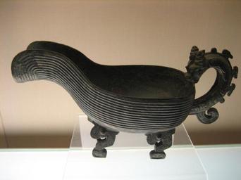 Keywords: Yi of Marquis Qi.jpg Yi of Marquis Qi <br>A Yi is an ancient ritual bronze vessel from China It is believed that it was used to hold water for washing the hands before rituals like sacrifices This Yi has the shape of half a gourd with a handle in the shape of a dragon and an oval base It is supported by four legs decorated with taotie animal mask designs The bottom shows 22 chinese characters written in 4 lines stating that the Marquis of Qi cast this Yi for his wife Mengji Liangnii the princess of the State of Guo It is from the late Western Zhou Dynasty -1046 to -771 and is part of the collections of the Shanghai Museum Height 24 7cm Length 48 1cm Weight 6 42 kg Yi du Marquis Qi <br>Un Yi est un type ancien de vase chinois en bronze Il est possible que les Yi servaient au lavage des mains avant les rituels tels que les sacrifices Ce Yi ressemble à une demie-gourde munie d'une anse en forme de dragon et sa base ovale est supportée par quatre pieds décorés de motif taotie masques zoomorphes Le dessous montre 22 caractères chinois rédigés sur 4 lignes déclarant que « le marquis de Qi a forgé ce Yi pour sa femme Mengji Liangnii princesse de l'état de Guo » Il date de la période tardive de la dynastie des Zhou occidentaux -1046 à -771 et fait partit de la collection du Musée de Shanghai Hauteur 24 7cm Longueur 48 1cm Poids 6 42 kg pl Wystawa Starożytnych Chińskich Brązów w Muzeum Szanghajskim zh-cn 齐 own Mountain 2006-04-08 <gallery> File 20090822 Shanghai Museum 3256 jpg File Western Zhou water vessel of Marquis Qi SM JPG File Yi of Marquis Qi jpg </gallery> Yi of Marquis of Qi