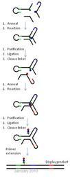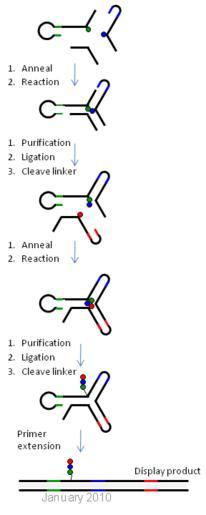 Keywords: Yoctoreactor library assembly wiki2.TIF en Figure 2 Stepwise assembly of a DEL library using YoctoReactor technology A 3-way reactor is shown here a Position 1 P1 and P2 BB are brought into close proximity and undergo a chemical reaction in the presence of a helper oligonucleotide in P3 b The structure is purified by polyacrylamide gel electrophoresis PAGE the P1 and P2 DNA is ligated and the P2 linker is cleaved c P3 BB is annealed to the P1-P2 ligation product from step b and a chemical reaction between P2 and P3 BBs takes place d The reaction product is purified by PAGE the DNA is ligated and P3 linker is cleaved yielding a compound OOO covalently attached to the folded yR e The yR is dismantled by primer extension yielding a double-stranded disply product exposing the reaction product for selection and molecular evolution own Viptrh 2010-05-21 Biochemistry |