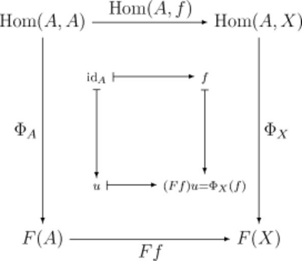 | Keywords: YonedaLemma-02.png  Math Proof of Yoneda's lemma in category theory TeX source \begin diagram tight \Hom A A \rTo \Hom A f \Hom A X \\ \scriptstyle\id_A \rMapsTo \scriptstyle f \\ \dTo< \Phi_A \dMapsTo \dMapsTo \dTo> \Phi_X \\ \scriptstyle u \rMapsTo \scriptstyle Ff u \Phi_X f \\ F A \rTo_ Ff F X \\ \end diagram Commutative diagrams |