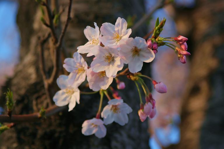 Keywords: yoshino cherry tree cherry cherry blossoms flowers pink faint pink blue sky leaf green blue sky blue otsu park yokosuka kanagawa japan japan april spring row of cherry blossom trees road prefectural road stem