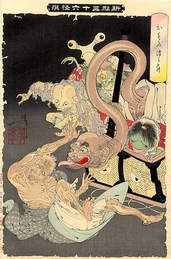 | Keywords: Yoshitoshi The Heavy Basket.jpg Tsukioka Yoshitoshi The Heavy Basket 1892 From the Thirty-six Ghosts series 9 25 x 14 25 The print depicts a number of monsters attacking an old woman From http //www japaneseprints net/prints cfm ID Yoshitoshi 20 2836 20Ghosts 29 here PD-Art People of Japan in art Legendary creatures of Japan Thirty-six Ghosts 36 Artworks missing infobox template | ||||