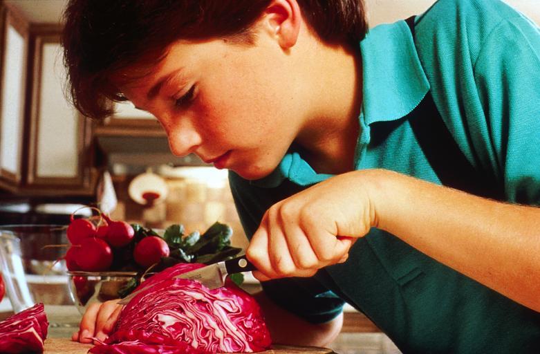 Keywords: Young boy slicing cabbage.jpg A Caucasian boy cuts into a purple cabbage on a cutting board with a bowl of radishes in the background Topics/Categories Food and Drink People -- Child Type Color Photo Source National Cancer Institute Bill Branson Photographer 2472 1989-03 Reuse Restrictions None - This image is in the public domain and can be freely reused Please credit the source and/or author listed above Bill Branson Photographer PD-USGov-HHS-NIH Media from National Cancer Institute Visuals Online Images uploaded by Fæ Red cabbage-based food Cutting of vegetables Radish-based food |