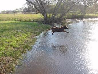 Keywords: Young chessie.JPG A young Chesapeake Bay Retriever in training own 2006-04-14 Patparks Chesapeake Bay Retriever Dogs in water Jumping dogs