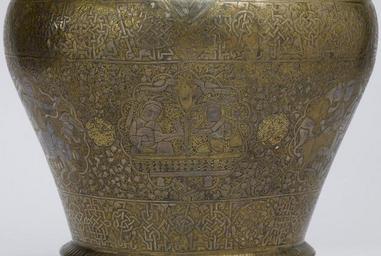 | Keywords: Yunus ibn Yusuf, "al-naqqash al-Mawsili" - Ewer - Walters 54456 - Detail F.jpg In a notable artistic innovation medieval Islamic artisans used precious metals- gold silver and copper- to decorate bronze and brass objects The richly decorated surface of this ewer features multiple bands of Arabic inscriptions and scalloped medallions enclosing musicians enthroned figures hunters and other scenes characteristic of medieval Islamic art The presence of the artist's signature here is noteworthy since the medieval Islamic artisan generally remained anonymous Yunus ibn Yusuf styles himself al-naqqash or decorator probably signifying that he was responsible for executing the inlaid designs He also ends his name al-Mawsili meaning from Mosul a famous metalworking center in northern Iraq However Yunus ibn Yusuf could just as easily have been working in Syria where metal workshops produced similar inlaid vessels during the 13th century between 1246 1247 AH 644 Crusader brass with silver inlay cm 44 5 31 8 16 5 accession number 54 456 22888 Dikran Kelekian New York and Paris Henry Walters city Baltimore Walters Art Museum Henry Walters Acquired by Henry Walters 1917 Signature Yunus ibn Yusuf al-naqqash al Mawsili; Date A H 644; Translation Glory to our lord the sultan the royal Exhibition of Persian Art Iranian Institute New York 1940 Highlights from the Collection The Walters Art Gallery Baltimore 1998-2001 place of origin Mosul Iraq Walters Art Museum license Islamic metalwork in the Walters Art Museum Yunus ibn Yusuf Media contributed by the Walters Art Museum needs category review Brass vessels containers |
