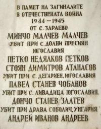 Keywords: Zaraevo zaginali 1944 1945.jpg bg Село За аево община Попово Паметна плоча с имената на загиналите за аевчани п ез Вто ата световна война own Wlado bg Vladimir Stoykov 2008-10-21 Zaraevo War memorials in Bulgaria Monuments and memorials in Targovishte Province |