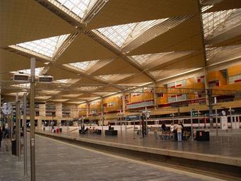Keywords: zaragoza spain train railroad railway mass transit transportation station depot platform tracks people ceiling decorative architecture modern