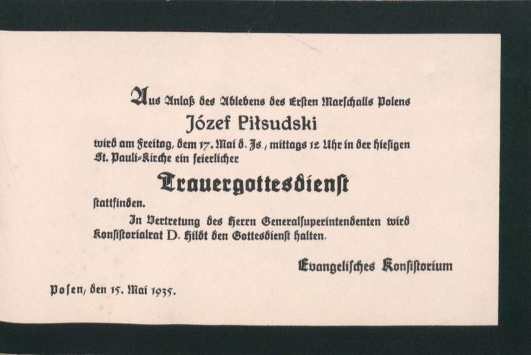 | Keywords: Zawiadomienie o nabozenstwie zalobnym za Jozefa Pilsudskiego od Konsystorza Ewangelickiego w Poznaniu.jpg  paper accession number 53/893/0/452 place of creation Poznań cc-zero Józef Piłsudski State Archive in Poznań Uploaded with VicuñaUploader Protestantism in Poznań 1935 in Poznań 1935 documents |