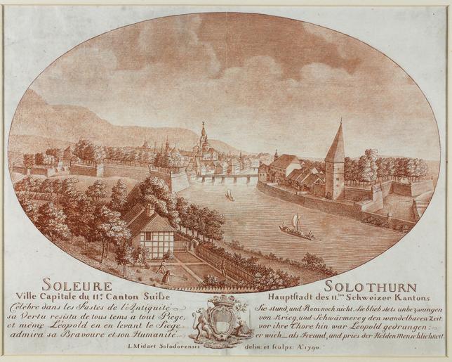| Keywords: Zentralbibliothek Solothurn - SOLEURE Ville Capitale du 11e Canton Suisse Célèbre dans les Fastes de lAntiquité sa Vertu resista de tous tems a tout Piege et même Léopold en en levant le siege admira sa Bravoure et - aa0006.tif Blick von W Aarhof auf die Stadt Solothurn im Vordergrund im Garten arbeitende Leute auf dem Fluss Segelschiffe mit Lasten 1790 Technique Aquatint paper brown Size mm 323 248 institution Zentralbibliothek Solothurn object history credit line accession number Call number aa0006 Zentralbibliothek Solothurn Public domain Information field ZBS form heading Vedute Zentralbibliothek Solothurn PD-old-100-1923 Historical images of Solothurn Laurent Louis Midart |