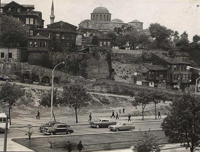 | Keywords: zeyrek unkapanı atatürk bulvarı atatürkbulvarı zeyrek camii zeyrekcamii molla zeyrek camii mollazeyrekcamii pantokrator camii pantokratorcamii pantokrator manastırı kilisesi pantokratormanastırıkilisesi ataturk boulevard ataturkboulevard zeyrek mosque zeyrekmosque pantokrator monastery pantokratormonastery eski i̇stanbul eskiistanbul old istanbul oldistanbul fatih i̇stanbul istanbul salt araştırma saltaraştırma salt research saltresearch salt online saltonline eski araba eskiaraba eski arabalar eskiarabalar old cars oldcars outdoor city architecture road The area of Zeyrek is located in Fatih on the fourth hill of İstanbul that leads from Atatürk Boulevard and Haliç. The Pantocrator Monastery at the center of this site is one of many major religious buildings in the neighbourhood that date back to the Byzantine period. In 1453 Muhammed the Conqueror converted the Pantocrator Church into the Molla Zeyrek Mosque. When it was renovated in the 18th century, baroque details were added to the mosque according to the architectural tendencies of the period. The last renovation was made in 1966, by the Pious Foundations. The mosque and the wooden 19th century houses that surround it are marked as a World Heritage Area under the protection of UNESCO. Today, Zeyrek is home to major monumental buildings from the Byzantine, Ottoman, as well as the Republican periods, including the Zeyrek Social Insurance Institution, designed by Sedad Hakkı Eldem, and the İstanbul Drapery Bazaar (İMÇ), designed by Doğan Tekeli, Sami Sisa and Metin Hepgüler. SALT Research Rahmi M. Koç, Sedad Hakkı Eldem Archive Fatih ilçesine bağlı olan Zeyrek semti, İstanbul’un dördüncü tepesi ve eteklerinde yer alır. Semt, Atatürk Bulvarı ve Haliç’ten başlayıp yükselen yamaçta, Bizans döneminden itibaren yapılmış çeşitli teraslamalar ve setlerin üstüne kuruludur. Bizans, Osmanlı ve Cumhuriyet dönemi yapılarına ev sahipliği yapmıştır. Adını, Fatih Sultan Mehmet’in Pantokrator Manastırı Kilisesi’nden dönüştürdüğü Molla Zeyrek Camii’nin baş müderrisi Zeyrek Mehmet Efendi’den alır. Bizans döneminden kalma önemli dinî yapılar arasında bulunan kilise, üç ayrı şapelin bir araya gelmesinden oluşur. İstanbul’un fethiyle birlikte şehirdeki ilk medresenin kurulduğu yapı, medreselerin Fatih Külliyesi’ne taşınmasıyla camiye çevrilir. 18. yüzyılda büyük bir onarım geçiren camiye, dönemin mimari anlayışına uygun olarak barok detaylar eklenir; son onarımı ise, Vakıflar İdaresi tarafından 1966’da gerçekleştirilir. Cami ile 19. yüzyıla ait ahşap konut dokusunu hâlâ koruyan çevresi, bugün UNESCO’nun koruması altında “Dünya Miras Alanı” kabul edilmektedir. Bölgede Sedad Hakkı Eldem’in tasarladığı Zeyrek Sosyal Sigortalar Kurumu binası ile Doğan Tekeli-Sami Sisa-Metin Hepgüler ortaklığında tasarlanan İstanbul Manifaturacılar Çarşısı (İMÇ), Cumhuriyet döneminin önemli miraslarındandır. SALT Araştırma Rahmi M. Koç, Sedad Hakkı Eldem Arşivi The area of Zeyrek is located in Fatih on the fourth hill of İstanbul that leads from Atatürk Boulevard and Haliç. The Pantocrator Monastery at the center of this site is one of many major religious buildings in the neighbourhood that date back to the Byzantine period. In 1453 Muhammed the Conqueror converted the Pantocrator Church into the Molla Zeyrek Mosque. When it was renovated in the 18th century, baroque details were added to the mosque according to the architectural tendencies of the period. The last renovation was made in 1966, by the Pious Foundations. The mosque and the wooden 19th century houses that surround it are marked as a World Heritage Area under the protection of UNESCO. Today, Zeyrek is home to major monumental buildings from the Byzantine, Ottoman, as well as the Republican periods, including the Zeyrek Social Insurance Institution, designed by Sedad Hakkı Eldem, and the İstanbul Drapery Bazaar (İMÇ), designed by Doğan Tekeli, Sami Sisa and Metin Hepgüler. SALT Research Rahmi M. Koç, Sedad Hakkı Eldem Archive Fatih ilçesine bağlı olan Zeyrek semti, İstanbul’un dördüncü tepesi ve eteklerinde yer alır. Semt, Atatürk Bulvarı ve Haliç’ten başlayıp yükselen yamaçta, Bizans döneminden itibaren yapılmış çeşitli teraslamalar ve setlerin üstüne kuruludur. Bizans, Osmanlı ve Cumhuriyet dönemi yapılarına ev sahipliği yapmıştır. Adını, Fatih Sultan Mehmet’in Pantokrator Manastırı Kilisesi’nden dönüştürdüğü Molla Zeyrek Camii’nin baş müderrisi Zeyrek Mehmet Efendi’den alır. Bizans döneminden kalma önemli dinî yapılar arasında bulunan kilise, üç ayrı şapelin bir araya gelmesinden oluşur. İstanbul’un fethiyle birlikte şehirdeki ilk medresenin kurulduğu yapı, medreselerin Fatih Külliyesi’ne taşınmasıyla camiye çevrilir. 18. yüzyılda büyük bir onarım geçiren camiye, dönemin mimari anlayışına uygun olarak barok detaylar eklenir; son onarımı ise, Vakıflar İdaresi tarafından 1966’da gerçekleştirilir. Cami ile 19. yüzyıla ait ahşap konut dokusunu hâlâ koruyan çevresi, bugün UNESCO’nun koruması altında “Dünya Miras Alanı” kabul edilmektedir. Bölgede Sedad Hakkı Eldem’in tasarladığı Zeyrek Sosyal Sigortalar Kurumu binası ile Doğan Tekeli-Sami Sisa-Metin Hepgüler ortaklığında tasarlanan İstanbul Manifaturacılar Çarşısı (İMÇ), Cumhuriyet döneminin önemli miraslarındandır. SALT Araştırma Rahmi M. Koç, Sedad Hakkı Eldem Arşivi |