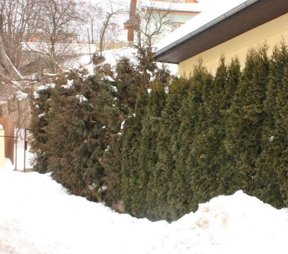 | Keywords: Zima 2010 01 22 1093.JPG en Thuja occidentalis hedge Czech republic EU Brno Komín cs Thuja occidentalis živý plot z túje dva různé kultivary zima Brno Komín Chaloupky own I Sáček senior 2010-01-22 Thuja occidentalis cultivated Plants in Brno-Komín |