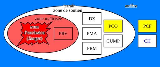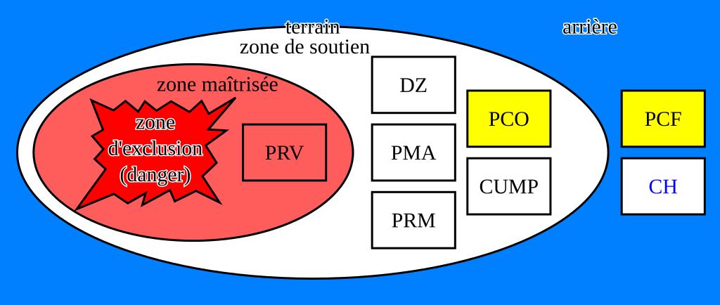 | Keywords: Zones plan novi.svg fr Zonage d'un plan novi Légende PRV point de rassemblement des victimes ; DZ drop zone zone d'atterrissage d'hélicoptère ; PMA poste médical avancé hôpital de campagne ; PRM point de rassemblement des moyens ; PCO poste de commandement opérationnel ; CUMP cellule d'urgence médico-psychologique ; PCF poste de commandement fixe ; CH centre hospitalier en Zoning of a Orsec-Novi plan French emergency plan for multiple casualties Caption terrain site field zone d'exclusion danger exclusion zone danger ; zone maîtrisée control zone PRV casulaty nest; zone de soutien support zone DZ drop zone PMA field hospital PRM meeting point for incoming ressources PCO operational headquarters CUMP psychological support for non-injured victims; arrière rear PCF fixed headquarters CH hospital 2016-08-31 own Cdang other versions inkscape cdang cc-zero Civil defense of France Emergency management in France |