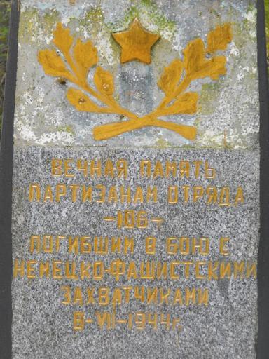 | Keywords: Zorin-otryad-106-1b.jpg ru Памятник па тизанам от яда 106 убитым в последнем бою 6 июля 1944 года Возведен в 1964 году в алибокской пуще бывшим команди ом от яда Шоломом Зо иным вместе с боевыми това ищами 2012-09-05 13 43 15 own Avner 53 47 13 4 N 26 13 57 5 E heading E cc-zero Sholom Zorin Uploaded with UploadWizard |