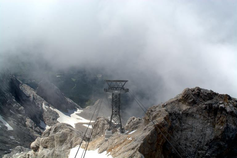 Keywords: zugspitze glacier garmisch outdoor snow silent view holiday mountain pass relaxation rest rock rocks far right eastern alps mountains wetterstein mountains rope cable car wire rope mast clouds fog sea of fog
