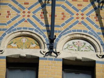 Keywords: Zurenborg Dolfijnstraat 55-57-59 (15).JPG fr Anvers Belgique Quartier Zurenborg Ensemble de trois maisons sises Dolfijnstraat n° 55 maison de gauche 57 maison du milieu et 59 maison de droite de style Ă©clectique teintĂ© pour les deux maisons latĂ©rales de mauresque et d ™art nouveau lequel ensemble fait partie en rĂ©alitĂ© d ™un ensemble concertĂ© plus vaste comprenant en outre les n° 19 et 21 de la Schorpioenstraat et les n° 51 et 53 de la Dolfijnstraat conçu par l ™architecte Joseph Bascourt en 1897 Photo maison centrale n° 57 gros plan sur les mosaĂŻques de la façade Zurenborg deel uitmakend van een grotere groepsbebouwing welke omvat de nrs 19 en 21 van de Schorpioenstraat en nrs 51 en 53 van de Dolfijnstraat ontworpen door architect Jos Bascourt in 1897 In beeld middelste huis nr 57 detail mozaĂŻeken gevel <br/> Vgl http //inventaris vioe be/dibe/relict/6735 Inventaris Bouwkundig Erfgoed geheel http //inventaris vioe be/dibe/relict/6736 Inventaris Bouwkundig Erfgoed nrs 55 en 59 en http //inventaris vioe be/dibe/relict/6737 Inventaris Bouwkundig Erfgoed middelste huis nr 57 self-photographed Torsade de Pointes 2010-06 Dolfijnstraat 55-57-59 Antwerp Mosaics in Belgium |
