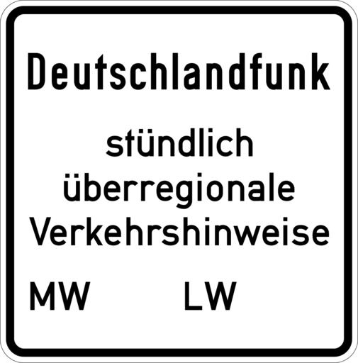 | Keywords: Zusatzzeichen 855 - Deutschlandfunk (zu Zeichen 368), StVO 1974.svg de Zusatzzeichen 855 Deutschlandfunk zu Zeichen 368 Am 1 Februar 1974 wurde Zeichen 368 Verkehrsfunksender eingeführt Das damals ebenfalls erwähnte Zeichen 369 Deutschlandsfunk erhielt seine Nummer erst 1975 durch Veröffentlichung im Verkehrsblatt Quelle Hinweiszeichen auf Verkehrsfunksender In Verkehrsblatt 29 1975 Nr 2 S 92 “94 Das Zeichen des Deutschlandsfunks sollte an Grenzübergängen oder an Parkplätzen mit starkem Verkehrsaufkommen aufgestellt werden Quelle Der Bundesminister für Verkehr StV 4/36 55 02 Hinweiszeichen auf Verkehrsfunksender In Straßen-Verkehrstechnik 4 1974 S 134 Hier ist eine Version des Zeichens vor Einführung der DIN-Schriftreform vom November 1981 zu sehen own Mediatus 12 Juli 2015 Herstellungsdatum + Signs User Mediatus/no-new-version Cc-zero PD-VzKat Diagrams of historic road signs of Germany 1974 set 855 svg Diagrams of motorway road signs of Germany 1974 set 855 svg German language signs SVG road signs in Germany 855 svg |