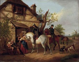 Keywords: Zwei Reiter vor Wirtshaus 19Jh.jpg Zwei durstige berittene Jäger vor Fachwerkhaus mit Schild 'Zum rothen Löwen' Öl auf Leinwand 47 5 x 60 5 cm http //www dorotheum com Dorotheum century 19 anonymous PD-old-100 Images from Dorotheum Inns in art Paintings of hunters Paintings of hunting men on horseback People with firearms in art Paintings of dogs |