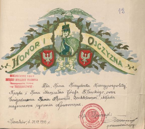 Keywords: Zyczenia dla Jozefa Pilsudskiego z okazji Nowego Roku(01).jpg paper accession number 53/4616/502 place of creation Sieraków cc-zero Józef Piłsudski State Archive in Poznań Uploaded with VicuñaUploader Sieraków Wielkopolska 1932 documents